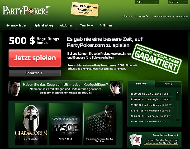 Bei PartyPoker gibt es andauernd sehr viele Turniere von jeder Art, sowie Buyins als auch Freerolls. Es gibt bei PartyPoker jede Woche ein $300,000 Guaranteed Turnier.